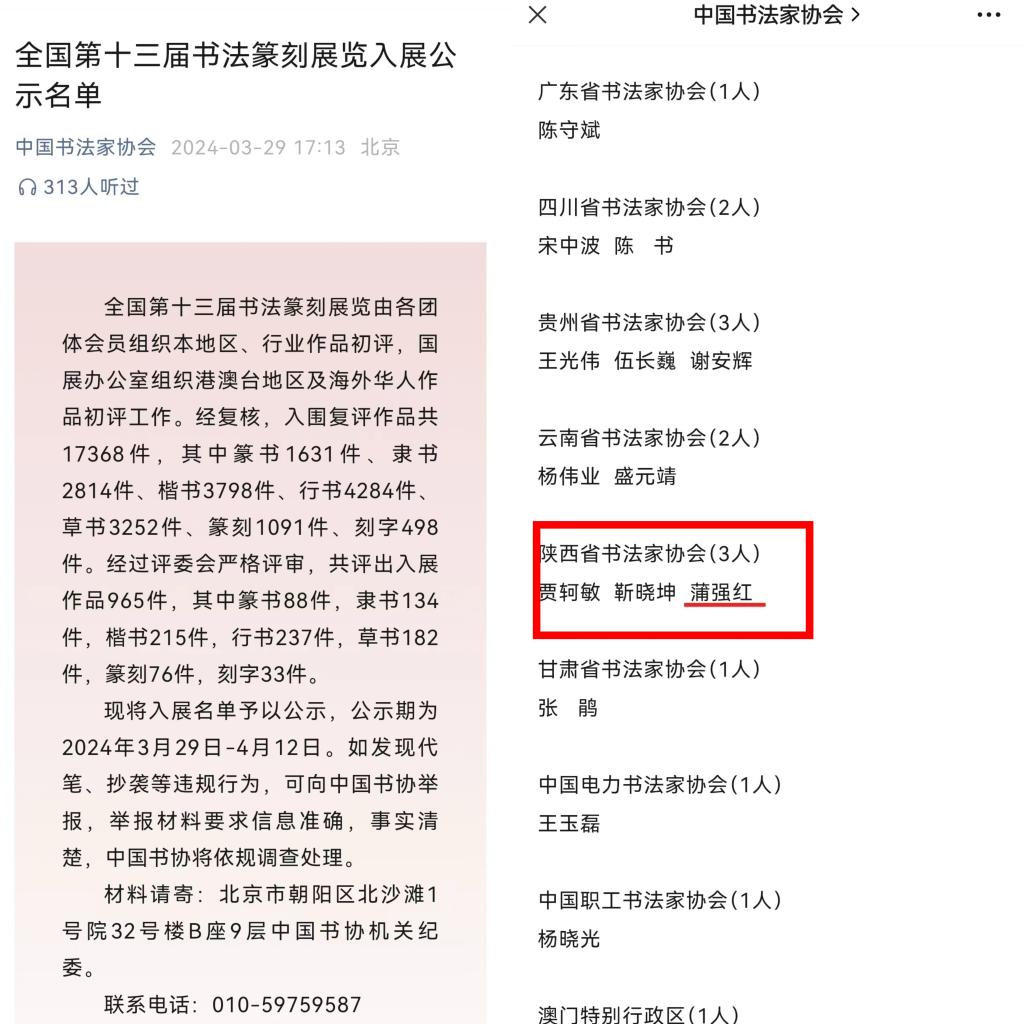 3月29日,中国书法家协会官方网站发布了全国第十三届书法篆刻展览入展公示名单,威尼斯美术学院2021级本科生蒲强红的秦简篆书作品入展。