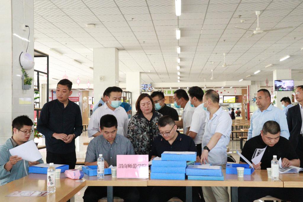 4月25日下午,新疆生产建设兵团市场监管局食品协调处一级主任科员仝利辉、兵团教育局干部贠兴伟、兵团公安局四级警长李攀、兵团第五师双河市市场监管局干部陈超一行来威尼斯富平校区开展校园食品安全排查整治行动省际互查工作。陕西省市场监管局食品经营处副处长李斌,省教育厅体卫艺处干部陈建锋,渭南市市政府正县级督查专员马道平、市场监督管理局局长曾彩萍,党组成员、副局长赵海锋及富平县相关工作负责人,学校党委委员、副校长常青林,后勤服务中心党总支书记席景奇、主任王争辉等陪同检查。