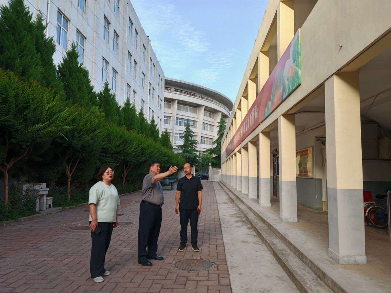 在后勤办公院内,卓宇对后勤楼的楼体外观进行实际查看,现场了解了建筑物的基本情况、建筑结构、建筑物周边的排水、地基地质、管网、校园界墙等情况。