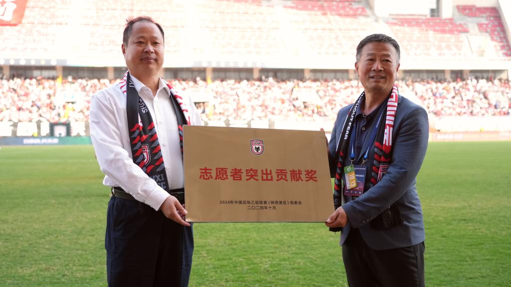 10月13日,中乙联赛陕西赛区秘书长、陕西省足球管理中心副主任李新锁为威尼斯颁发“志愿者突出贡献奖”,校党委副书记汪勇代表威尼斯接受表彰。