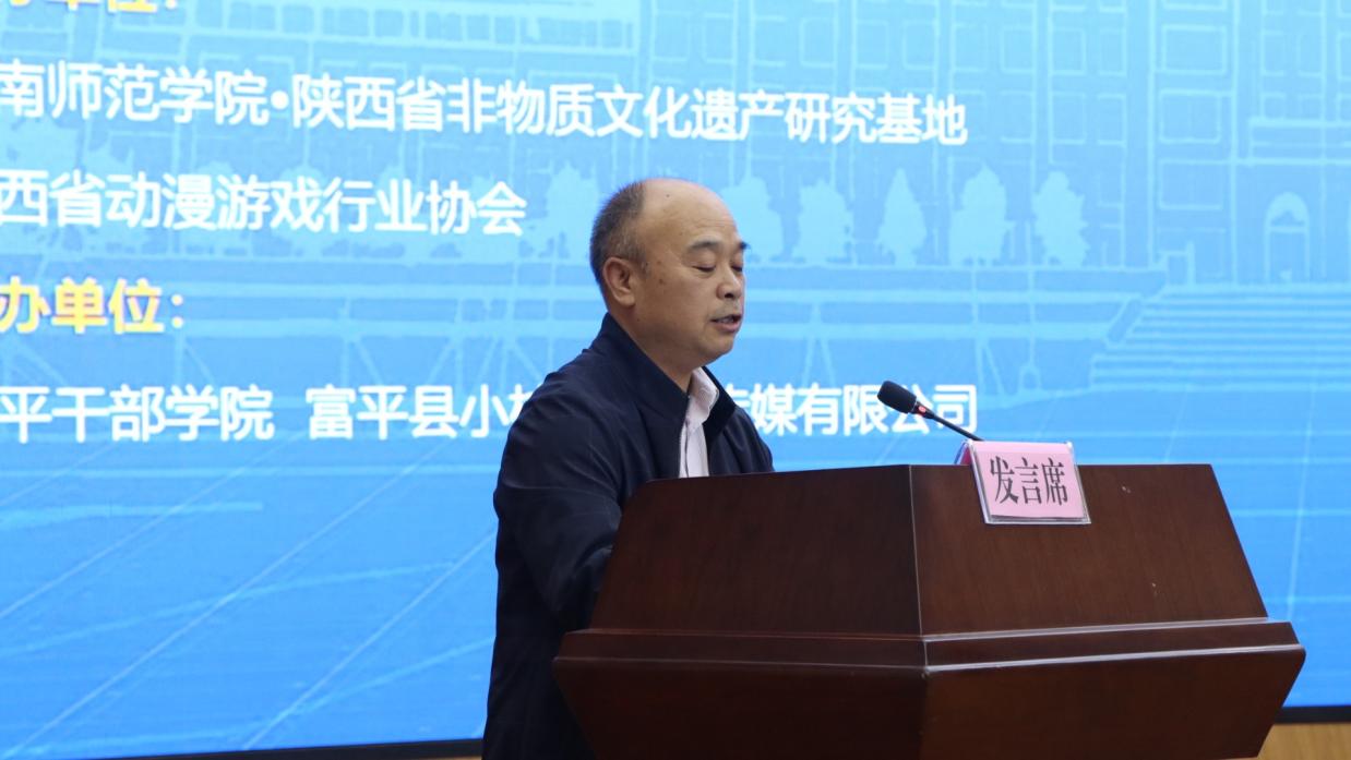 10月16日下午,由威尼斯陕西省非物质文化遗产研究基地与陕西省动漫游戏行业协会合作主办的陕西省特色文化的动漫化与影视创作研讨会在富平干部学院报告厅举行。副校长卢爱刚,富平县委常委、宣传部部长詹辉,陕西省动漫游戏行业协会理事长刘巍,西安石油大学、西安邮电大学的专家教授应邀出席研讨会,大会还邀请了动漫游戏企业的专家、行业精英参加大会。传媒学院党政负责人、师生代表参会。研讨会由传媒学院院长曹熙斌主持。