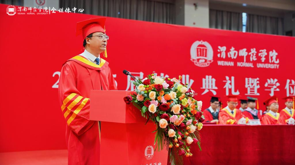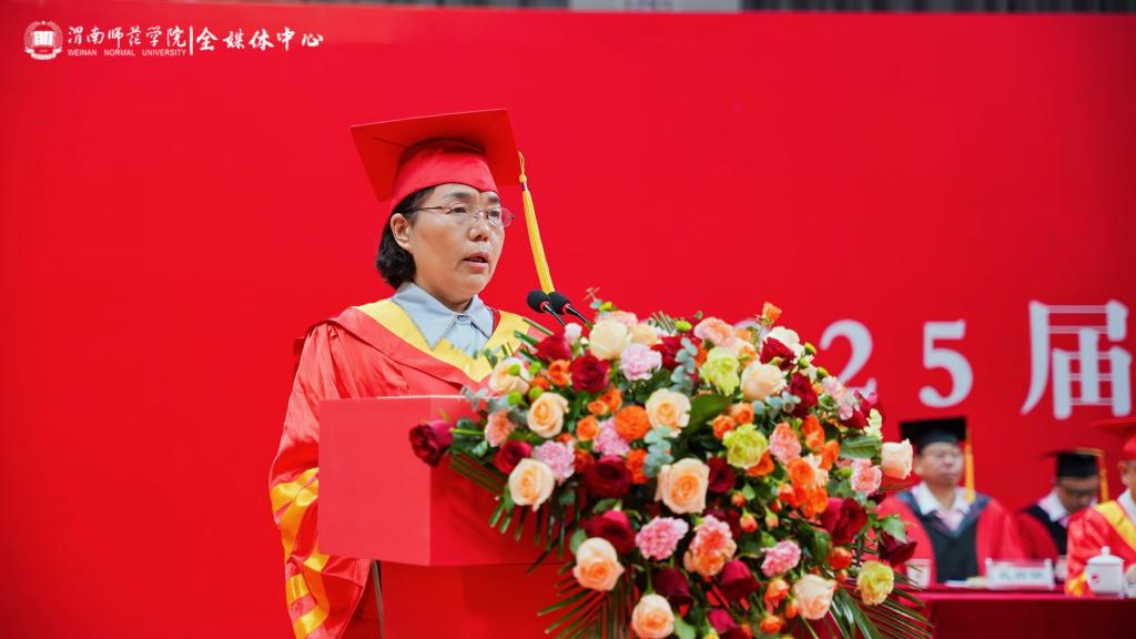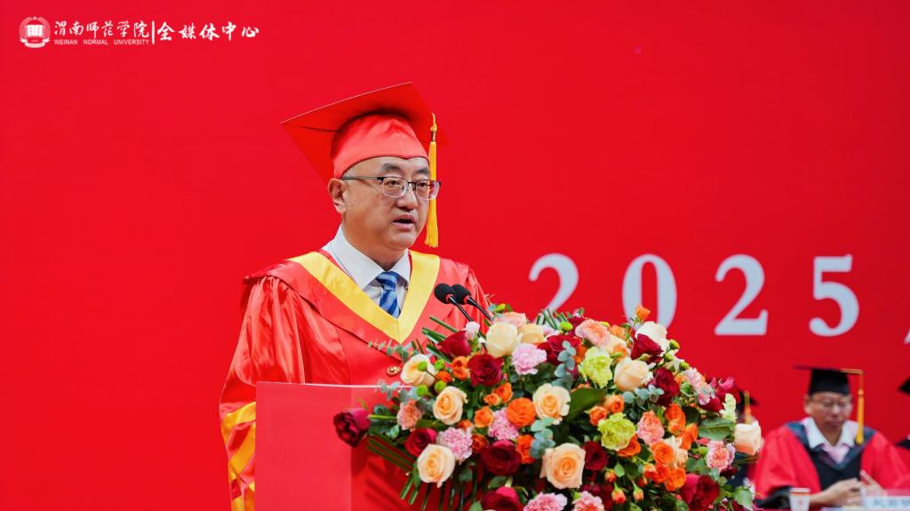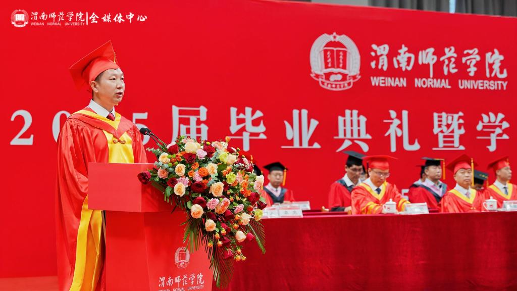 李强代表学校向毕业生们致以热烈的祝贺和衷心的感谢,祝贺同学们顺利完成本科阶段学业,走向人生更广阔的天地。李强勉励所有毕业生,青春不散场,奋斗正当时。他结合2025年陕西高考作文题目“如果有一天,我们能够将梦赠予他人”,向广大毕业生赠送了四个梦:一是传承文化基因、坚定文化自信的“传薪者之梦”,勉励大家发挥专业所长,推动中华文化走向世界,将个人成长汇入文化传承的洪流;二扎根中国大地、服务国计民生的“蒲公英之梦”,希望大家“向下扎根,向上生长”,牢记“至诚报国”的校训精神,把个人理想融入国家发展伟业;三是提灯引路育才、启智润心弘道的“教育家之梦”,在未来的岗位上,坚守教育理想、传承教育情怀、创新教育实践、奉献教育事业,做新时代的传灯人,筑梦人;四是拥抱时代变革、引领创新发展的“弄潮儿之梦”,提醒大家要保持终身学习的态度,善于识变求变,以人文精神为灯塔,以科技思维为引擎,勇立时代潮头,迎接人生挑战。“无论你们走得多远,渭师永远是你们的精神家园”,在祝福同学们前程似锦、梦想成真的同时,他叮咛大家“常回家看看”。