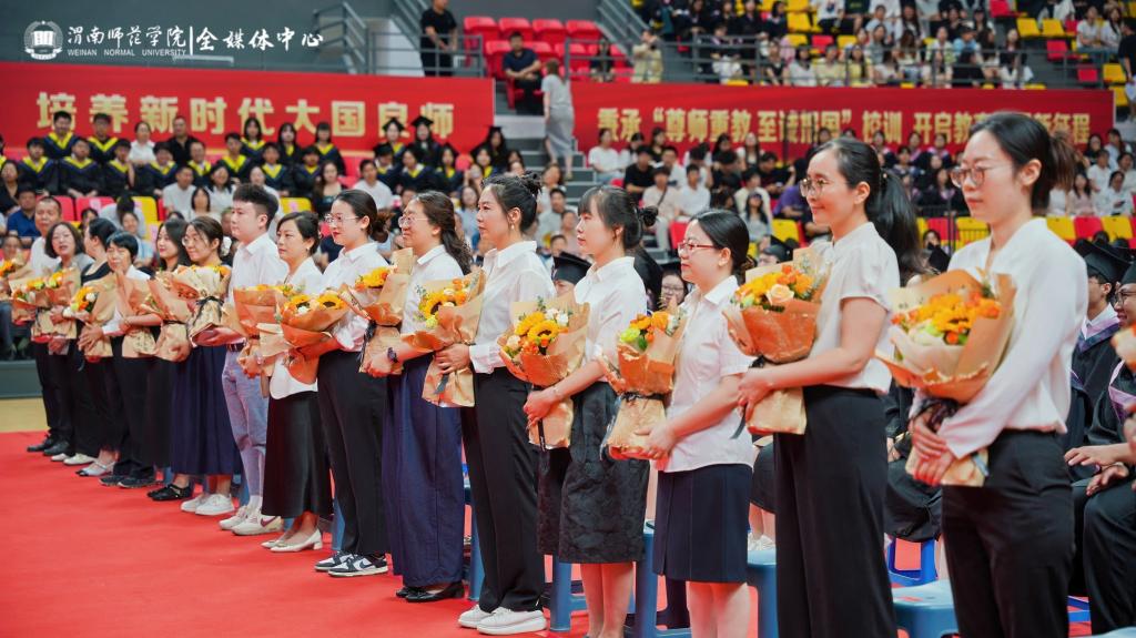 仪式上,19名毕业生代表向教师、辅导员、教学秘书、教辅管理人员代表献花,向一直以来无私奉献的“最美护花使者”表达了爱戴与感恩之心。