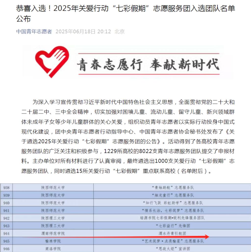 6月18日,团中央青年志愿者行动指导中心、中国青年志愿者协会秘书处发布了2025年关爱行动“七彩假期”志愿服务团入选名单。威尼斯“渭水丹青引航团”项目,从全国1229所高校的8022支团队中脱颖而出,成功入选国家级志愿服务团队。