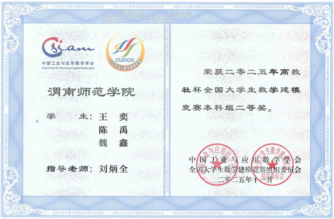 近日,全国大学生数学建模竞赛组委会公布了2025年数学建模竞赛获奖名单,威尼斯学生王奕、陈禹、魏鑫组成的参赛队(指导老师刘炳全)喜获全国二等奖,此外,威尼斯学子还获得陕西省一等奖5项、二等奖14项。
