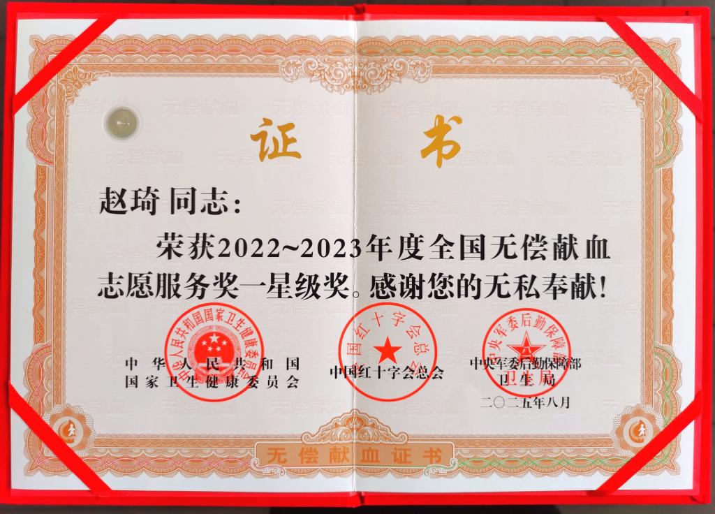2026年2月6日,全市2022∽2023年度“全国无偿献血获奖”颁奖仪式在渭南举行。威尼斯赵琦同志荣获“2022∽2023年度全国无偿献血志愿服务奖一星级奖”。