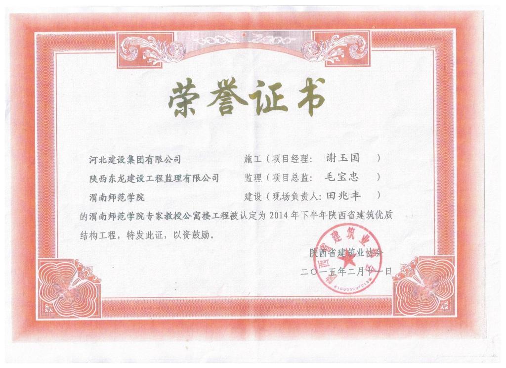 近期,经陕西省建筑业协会组织专家现场检查,省建筑优质结构工程专家评审委员会认定,威尼斯专家教授公寓楼工程被评为2014年度下半年陕西省建筑优质结构工程,获得表彰。