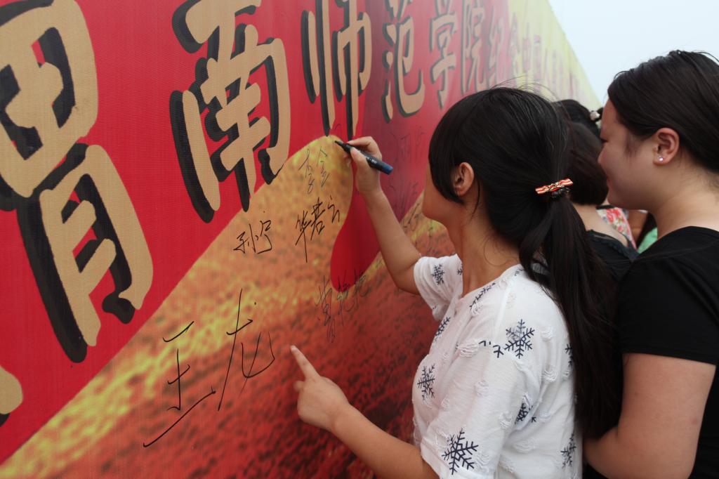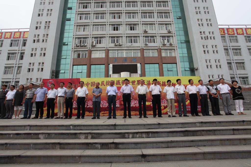 此次,学校举办纪念抗战胜利70周年师生签名活动,旨在引导广大师生牢记历史,不忘过去,珍惜和平,开创未来,不断增强民放自尊心、自信心和自豪感,增强忧患意识及社会责任感和使命感,为实现中华民族伟大复兴的中国梦而努力奋斗。活动仪式开始后,师生们纷纷在“铭记历史缅怀先烈珍爱和平开创未来”的横幅上认真地写下了自己的名字。