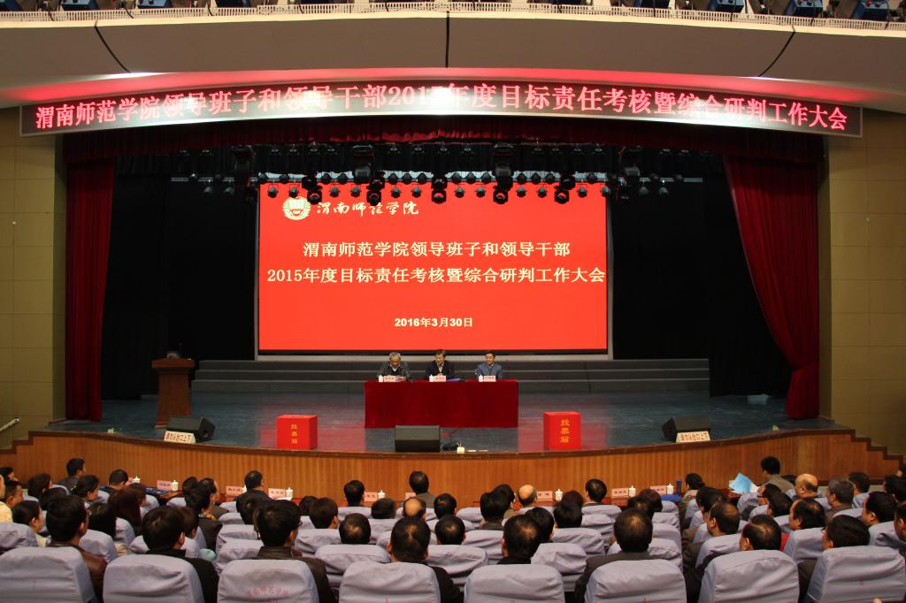按照省委组织部、省委高教工委的安排,3月30日,学校在陶然楼演艺厅召开校级领导班子和领导干部2015年度目标责任考核暨综合研判工作大会。陕西省属高校领导班子和领导干部目标责任考核暨综合研判第四工作组组长、省委高教工委委员、统战部部长李智军等一行6人来威尼斯,对学校领导班子和领导干部进行年度目标责任考核和综合研判。大会由校党委书记张金安主持。