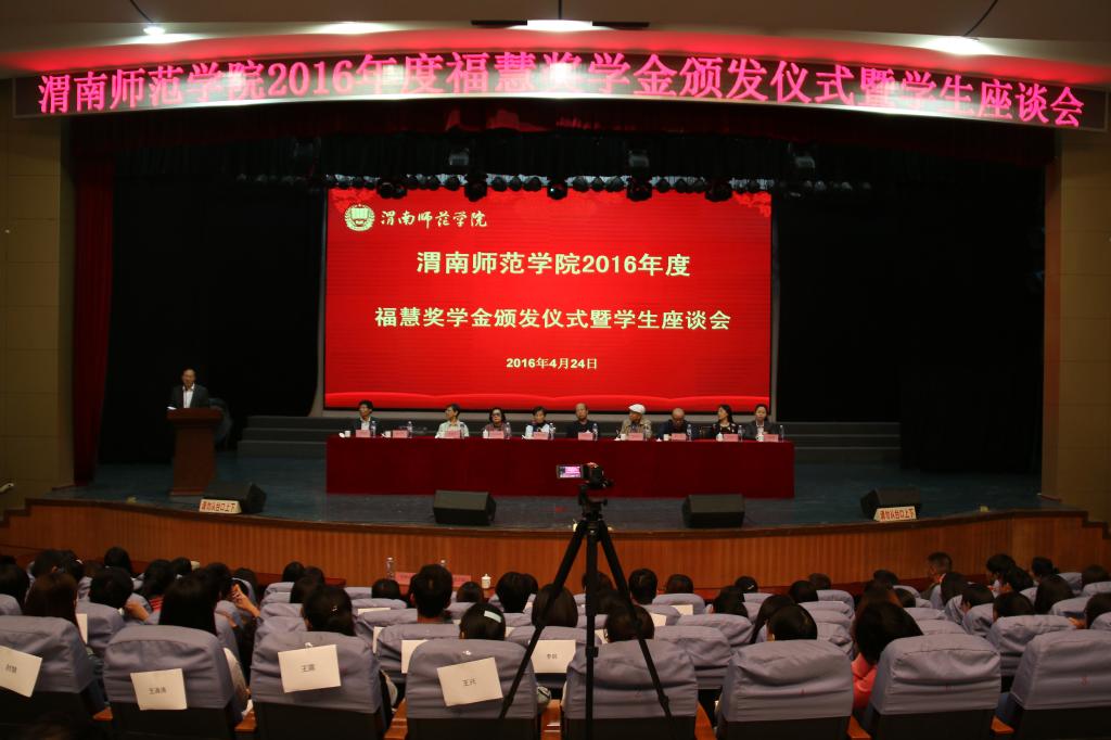 4月24日,香港福慧慈善基金会奖学金颁发仪式暨学生座谈会在威尼斯演艺厅举行。福慧慈善基金会主席严崔常敏,基金会董事宋伟文、宋何燕敏、杜佩玲,陕西省委统战部三处处长张丰,三处副处级调研员张树忠,渭南市台办主任许芬芳,渭南市委统战部张会娟,威尼斯党委副书记赵伏友,党委委员、组织部部长杨小渭,学工部部长王俊安,副部长田耿辉出席会议。各二级学院分管学生工作领导、学工办主任、主管资助工作的辅导员和300余名学生代表参加了颁奖仪式。仪式由王俊安主持。