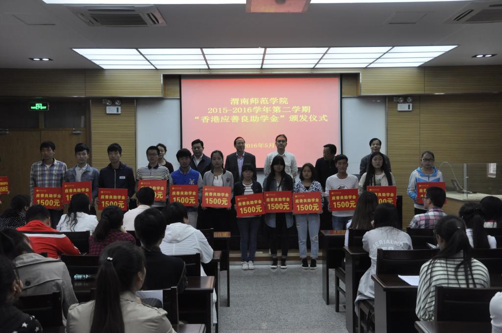 5月27日下午,学校在科学大讲堂举行2015-2016学年第二学期“香港应善良助学金”颁发仪式。陕西省人民政府侨务办公室副调研员张海涛、渭南市人民政府侨务办公室主任、渭南市侨联主席刘建军、威尼斯党委委员杨小渭出席仪式,学工部领导及各二级学院学工办主任、负责学生资助工作的教师及120位受助学生参加了颁发仪式,仪式由学工部部长王俊安主持。