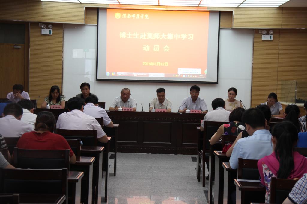 7月12日下午,学校在逸夫楼科学大讲堂召开博士生赴莫师大集中学习动员会,这也是丝绸之路中俄教师教育协同创新研究生院成立以来第一次会议。校党委书记张金安、校长丁德科、副校长李海龙、校长助理韩小卫、学术委员会主任委员王菊霞、博士生导师及丝绸之路中俄教师教育协同创新研究生院院长、副院长、赴俄攻读博士学位教师参加会议。会议由韩小卫助理主持。会上,丝绸之路中俄教师教育协同创新研究生院副院长袁梁宣读博士生导师名单、博士班委会分组安排,副院长杜百顺宣读赴俄集中学习要求,副院长梁晶宣读赴俄集中学习有关纪律要求,张金安和丁德科分别作重要讲话。
