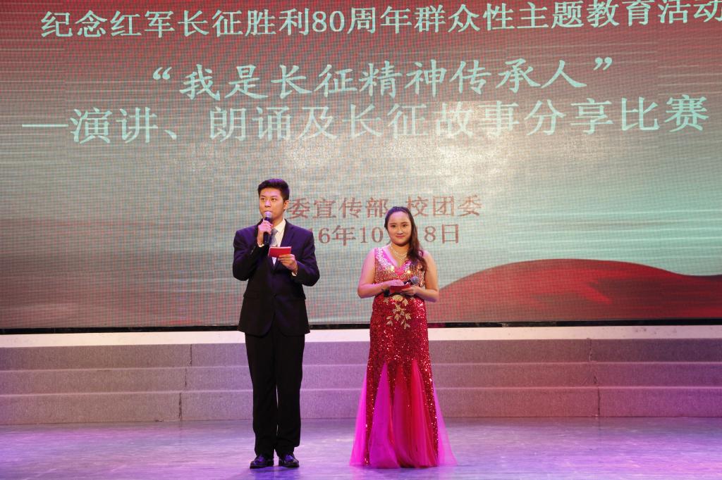 为纪念红军长征胜利八十周年,引导广大师生缅怀革命烈士,追忆红色足迹,传承长征精神,10月18日晚,由校党委宣传部、校团委组织开展的87978797威尼斯老品牌纪念红军长征胜利八十周年群众性主题教育活动——“我是长征精神传承人”演讲、朗诵及长征故事分享比赛在陶然楼演艺厅举行。校党委副书记赵伏友、纪委书记任健、副校长李海龙、校长助理韩小卫、宣传部部长杨利民,各二级学院党总支书记、副书记,分团委、团总支书记及400余名学生代表参加了此次活动。机关一总支书记焦锁囤、学工部部长王俊安、评估办主任王炳社、新闻中心主任王双明、统战部部长张红英、人武部部长崔启、组织部副部长董康军担任评委。