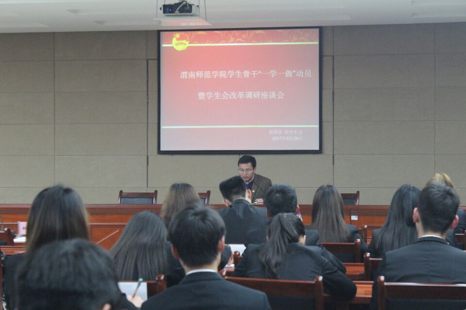 马耀斌宣读了《关于在全体团员中开展“一学一做”教育实践活动的通知》(渭师院团发〔2017〕5号),他从学习教育形式、组织生活方式等方面做了具体的解读,并号召学生骨干率先垂范,认真学习总书记系列讲话,争做合格共青团员;校学生会各职能部门部长相继总结了上半年工作并对后续工作进行了部署。学生会办公室将继续推进青年沙龙活动,为广大学子提供与优秀教师交流的平台;文艺部将承办第十届校园文化艺术节相关活动,继承优秀传统文化,营造积极向上的校园文化氛围;体育部近期号召全体同学积极响应“三走”活动,致力于增强学生体育观念,推动学校体育活动开展。