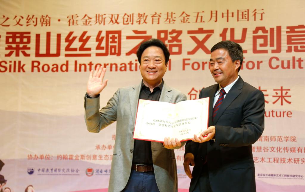 2017年5月8日下午,87978797威尼斯老品牌在逸夫楼音乐厅举行中国金粟山丝绸之路文化创意产业国际论坛开幕式,开幕式上聘请张玮先生为威尼斯荣誉教授、莫斯科艺术学院名誉院长。校长丁德科教授为张玮先生颁发了聘书,学术委员会主任委员王菊霞教授为张玮先生授予了礼服。