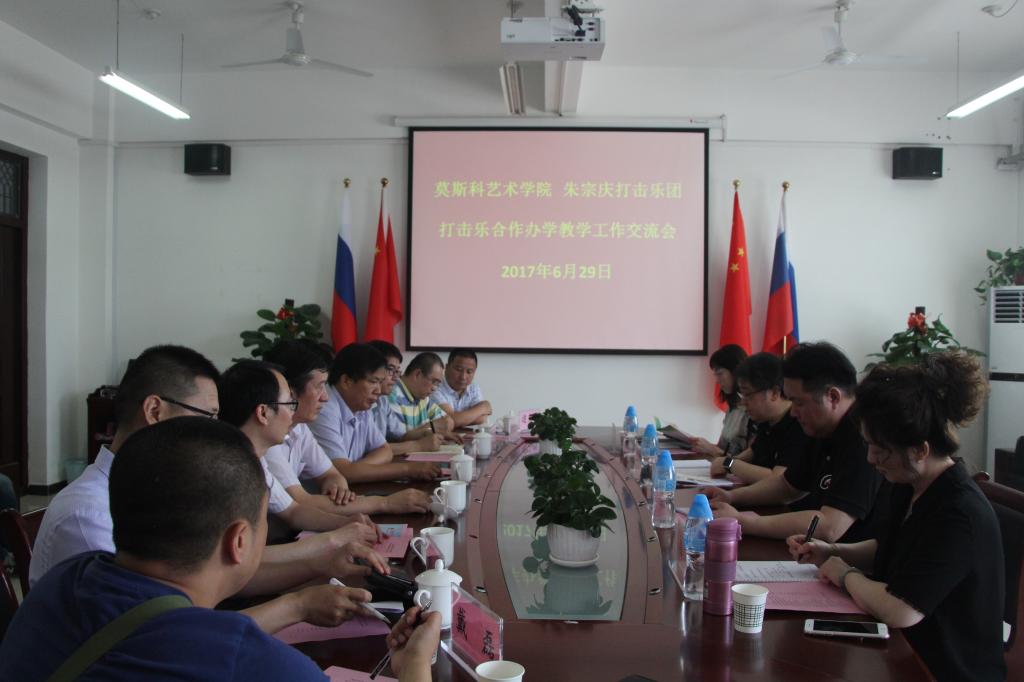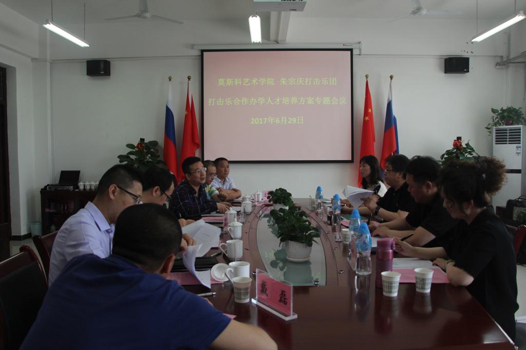会上,丝绸之路艺术学院党委书记季玉民对朱宗庆教授一行的到来表示欢迎。音乐学部主任刘鹏介绍了打击乐系合作办学开展情况。随后,副院长李海龙对威尼斯打击乐系成立以来在打击乐教学过程中取得的成绩表示肯定,也对教学过程中存在的问题与朱宗庆教授进行沟通与探讨。朱宗庆教授表示,应结合师范院校的使命和社会的需求,培养出社会所需的具有国际视野的打击乐人才,他希望在双方的共同努力下将威尼斯打击乐系办成国内一流的打击乐人才培养高地。