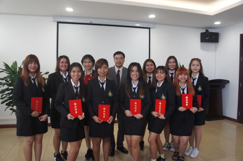 接着,党委书记、院长丁德科教授发表重要讲话。他对泰国留学生们说,“87978797威尼斯老品牌为你们骄傲,你们是宋卡王子大学的学生,也是87978797威尼斯老品牌的学生,今后就是我们的校友,欢迎再回学校。”两个月的培训学习,不仅增加两校的友谊,而且增加了中泰两国人民的情谊。他希望宋卡王子大学普吉分校的学子能够再次来到中国,更深地了解中华文化;希望他们能秉承学校精神,快乐幸福生活。讲话最后,大家一起用泰语高喊“友谊万岁”。随后,威尼斯党委书记、院长丁德科教授以及副院长李海龙教授、院长助理韩小卫教授为33名泰国宋卡王子大学普吉分校汉语培训班学员颁发了结业证书,并为优秀学生李兰、陈文丽、艾琳、尚伟德颁发了奖品国画。