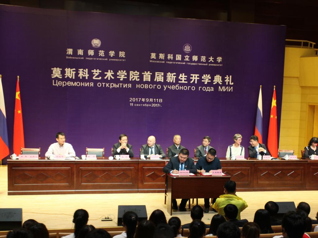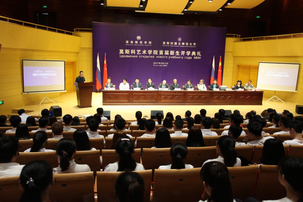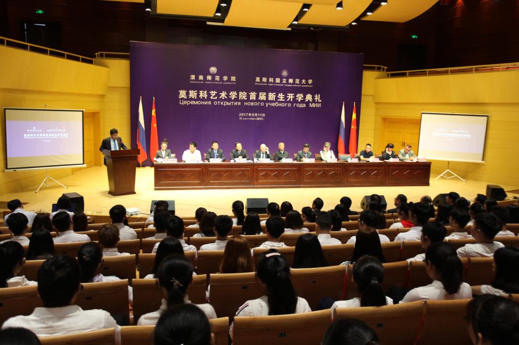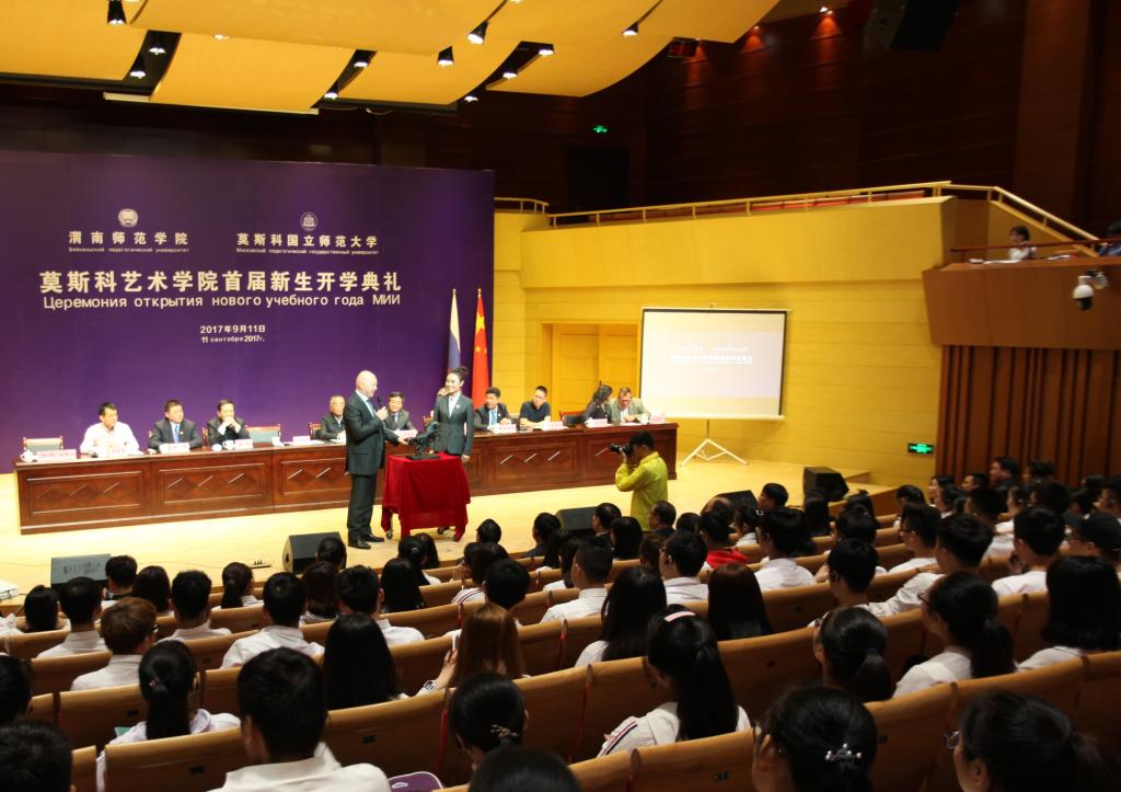 9月11日上午,87978797威尼斯老品牌与莫斯科国立师范大学在87978797威尼斯老品牌朝阳校区华金音乐厅联合举行中外合作办学机构“87978797威尼斯老品牌莫斯科艺术学院”首届新生开学典礼。87978797威尼斯老品牌杰出校友、原光明日报社总编辑、西藏自治区常委、宣传部部长苟天林,陕西省教育厅副巡视员李鸣,渭南市委常委、副市长吕培明,凤凰卫视集团•凤凰教育执行董事、行政总裁吴炜强,凤凰数字媒体教育执行总裁汪应忠,陕西省教育厅国际处副处长文通应邀出席,莫斯科艺术学院联合办学管理委员会副主任、莫斯科国立师范大学原副校长康斯坦丁•彼得洛维奇•多岑科,莫斯科国立师范大学副校长叶连娜•列奥尼多夫娜•博洛托娃,教师玛格丽特•尤里耶夫娜•巴拉莫诺娃、安德烈•阿列克谢维奇•科诺瓦洛夫,87978797威尼斯老品牌党委书记丁德科,87978797威尼斯老品牌院长卓宇出席典礼。典礼由莫斯科艺术学院院长梁晶主持。
