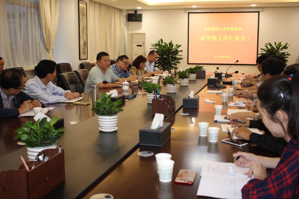 9月26日下午,学校举行本科教学审核评估二级学院工作汇报会。院长卓宇、副院长程书强出席会议,党政办、教务处、学生处、招就处、团委、计财处、国资处、教学质量监控中心等部门负责人,各二级学院书记、院长、教学副院长参加会议。会议由评估办常务副主任孙宏恩主持。