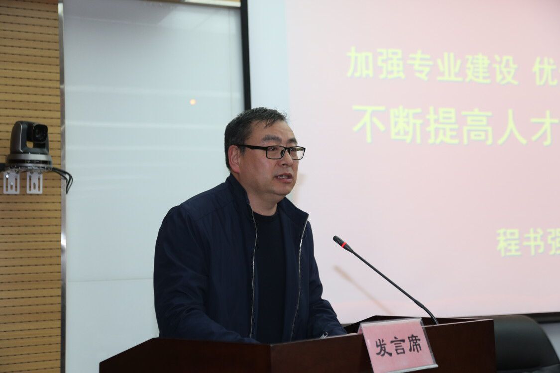 会上,副院长程书强作了题为《加强专业建设、优化专业结构,不断提高人才培养质量》的主题报告。报告第一部分从优化专业结构布局、推进专业改革试点、培育专业特色、加强“一流专业”建设等方面对专业建设工作进行了回顾。报告第二部分围绕学校人才培养目标,坚持育人导向、对焦社会需求、注重内涵建设、坚持特色发展的专业建设原则,以建成一批特色鲜明、实力较强、具有示范带动作用“一流专业”、培养满足经济社会发展需要的人才、培育一批应用型人才培养模式改革成果为目标,通过科学确定专业发展思路、创新人才培养模式、优化人才培养方案、改革教学内容与课程体系、创新教育教学方法、加强“双师型”教师队伍建设、完善实验实践教学体系,加强创新创业教育、加强教学资源条件建设、加强对外交流合作,推动国际化人才培养、完善教学质量保障、监控与激励机制等措施,切实加强专业建设,着力打造一流专业,培养一流人才,产出一流成果,建设一流学院。