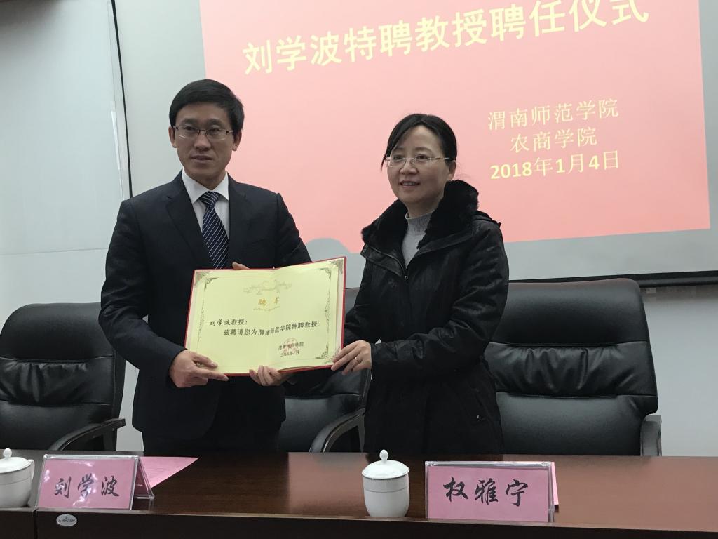 1月4日下午,农商学院在逸夫楼科学大讲堂举行特聘教授聘任仪式,聘请日本名古屋大学食品功能化学博士、西北农林科技大学食品科学与工程学院院长、测试中心主任、博士生导师刘学波教授为该院特聘教授。副院长权雅宁出席聘任仪式并为刘学波教授颁发聘书,聘任仪式由农商学院院长焦更生主持,人事处处长赵江永参加了聘任仪式。