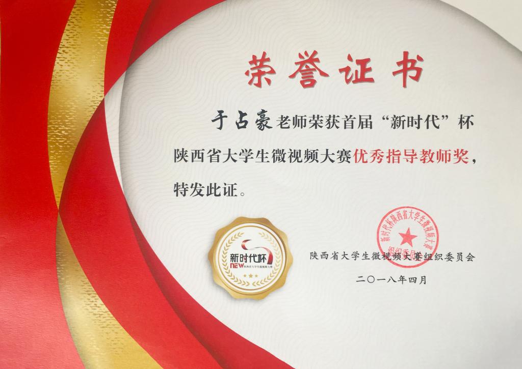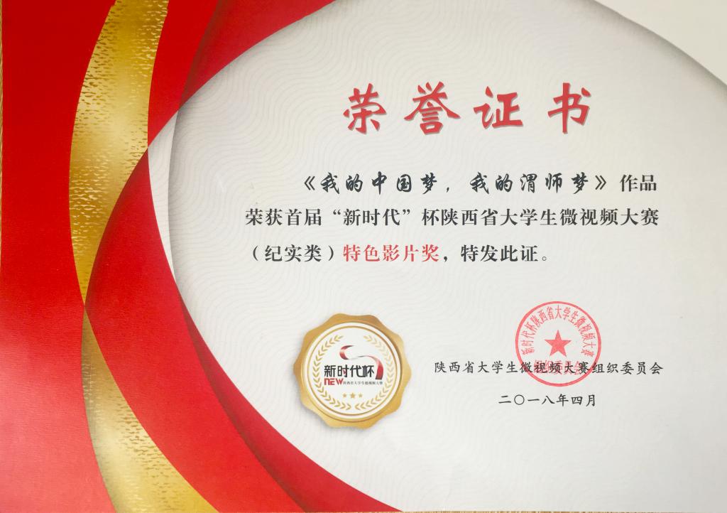 4月19日,2018年首届“新时代”杯陕西省大学生微视频大赛颁奖典礼在西安交通大学举行。由威尼斯全媒体中心微视频工作室创作的《我的中国梦·我的渭师梦》和《大学生提笔忘字新思考》两部作品荣获纪实类“特色影片奖”,于占豪荣获“优秀指导教师奖”。