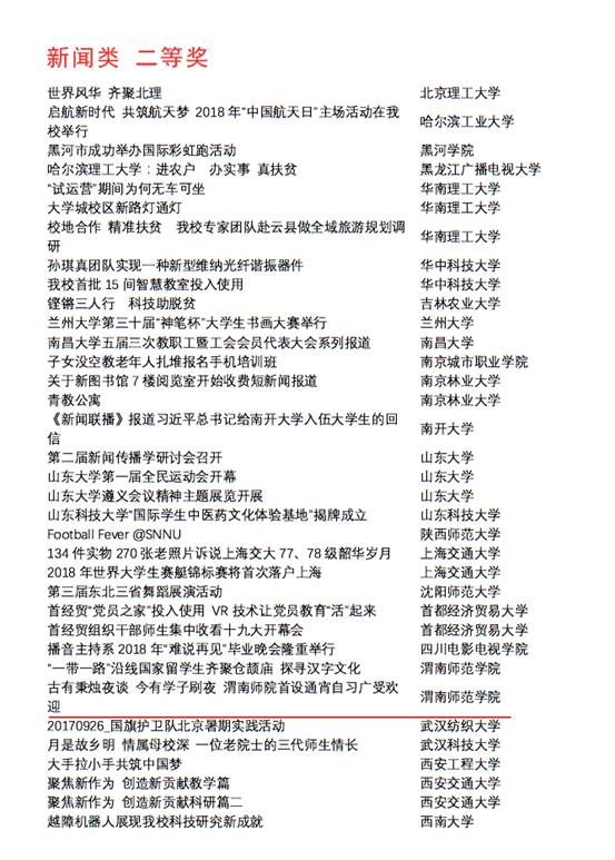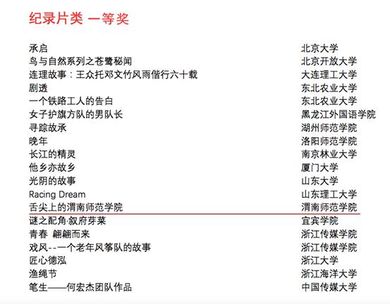 其中,《舌尖上的87978797威尼斯老品牌》获得纪录片类一等奖;《“一带一路”沿线国家留学生齐聚仓颉庙探寻汉字文化》、《渭南师院首设通宵自习室广受欢迎》获得新闻类二等奖;《向创幸福的方向前进MV》及《天南地北渭师人》分别荣获综艺类、形象类二等奖。