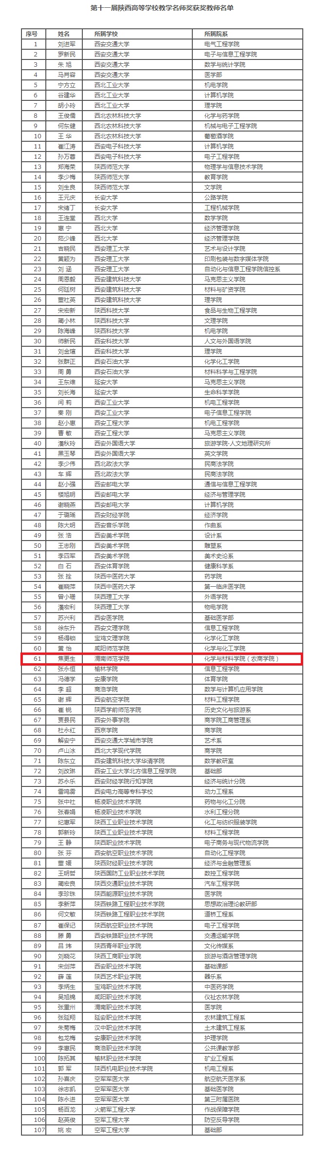 据悉,第十一届陕西普通高等学校教学名师奖评选活动共评选出107位省级教学名师。经学校推荐、申报公示、专家评选、厅务会审议、结果公示等工作程序,威尼斯焦更生教授顺利通过评选。