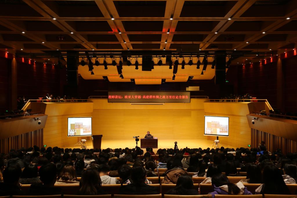 报告会上,威尼斯参会师生观看了高建群作为“2018年丝路品牌万里行文化使者”丝绸之路万里行的相关视频片。高建群作了《欧亚大穿越——高建群丝绸之路万里行走全报告》,他用大量生动的图片,从地理、历史、文化等方面讲述了从西安出发历经70余天两万两千公里抵达英国牛津大学城一路的见闻与所感所获。与会师生在高建群的讲述中学习领略了丝绸之路沿线亚欧大陆国家的地貌、风景、民俗与史实。整个报告以独特的视角、朴实的语言,展现深邃的思想。高建群还与同学们进行互动,一一解答同学们提出的问题,他希望同学们能够真正在未来学生生活中读万卷书、行万里路。
