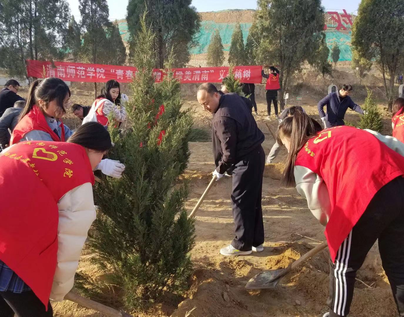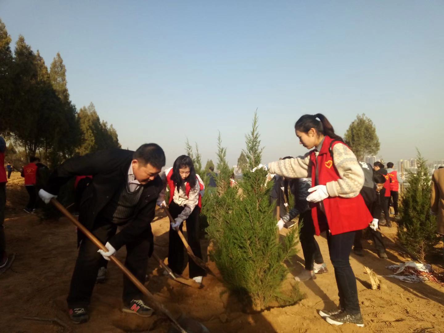 3月12日上午,学校党委书记卓宇、校长赵曼与科技发展集团公司部分干部职工、学生志愿者一起来到解放路南端拓宽路段植树点参加义务植树活动。