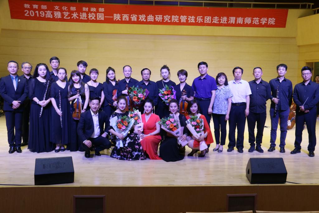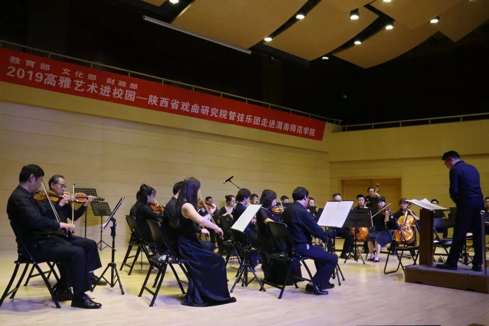 为全面落实习近平总书记在全国教育大会上的重要讲话精神,弘扬主旋律,坚持以美育人,提高广大青年的审美和人文素养,坚定文化自信。6月19日晚,由教育部、文化旅游部、财政部联合主办的2019高雅艺术进校园——陕西省戏曲研究院管弦乐团在威尼斯华金音乐厅成功举办。校党委副书记任健,副校长王菊霞,党委委员、校长助理韩小卫,部分党群部门、二级学院领导及500余名学生观看演出。