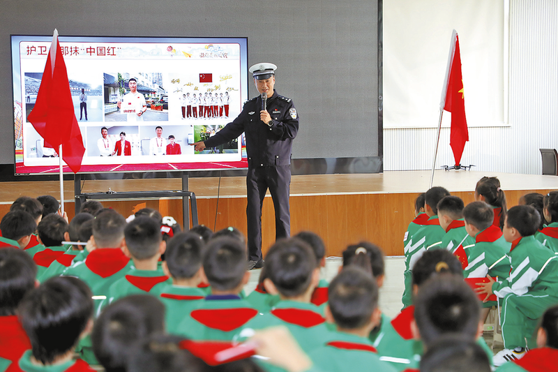 民警田晨向学生分享自己与国旗的故事 本报记者 吕佳 见习记者 马周宁 摄