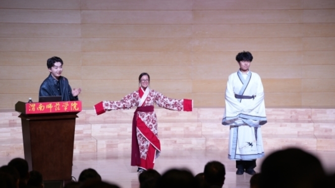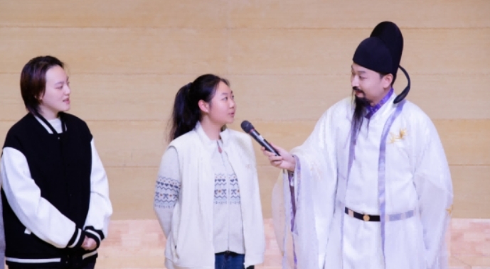 “礼仪是传统文化的活态载体。”互动环节,冯佳晨带领师生沉浸式体验传统礼仪:从基础的“拱手礼”手势规范(右手在外、左手在内,寓意“包容”),到唐代“叉手礼”的动作细节(双手交叠于胸前,拇指上翘),她逐一示范并纠正,让师生在一招一式中体会古人“礼者,天地之序也”的处世智慧。此外,她还设计了“曲水流觞”诗词互动游戏,以盛唐文人雅集的形式,激发师生对古典诗词的兴趣,现场诗词接龙、妙语连珠,气氛热烈。