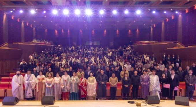 子虞——从汉服霓裳之间,娓娓道来千年故事,解锁服饰里的文明密码。陕西省青年新媒体协会国风专业委员会秘书长子虞精心策划并举办了“霓裳里的历史”汉服体验活动。他热情地邀请现场观众中的师生上台参与,现场的外籍教师也积极参与。依次展示汉唐明清等不同朝代风格各异的服饰。师生们在他细致地指导下,认真地试穿汉服,仔细整理衣襟、系好腰带,亲身领略“衣袂飘飘”的传统服饰独特之美。同时,他还对这些服饰的形制、纹样背后所蕴含的丰富文化内涵进行了逐一详细讲解。