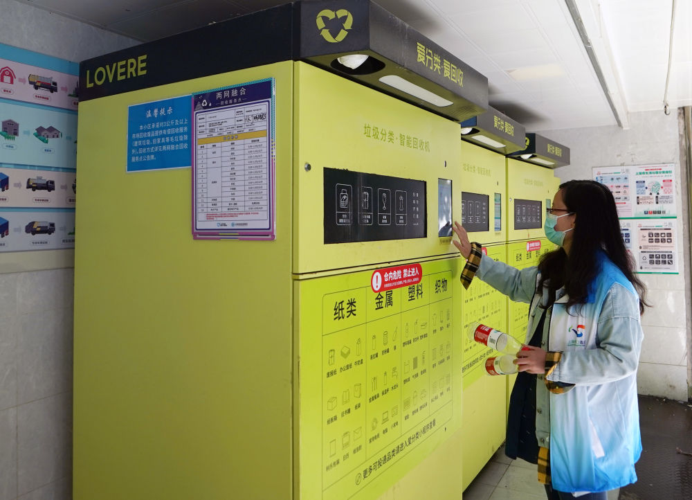 2023年5月23日,志愿者在上海市虹口区嘉兴路街道爱家豪庭小区演示垃圾分类智能回收机的使用方法。