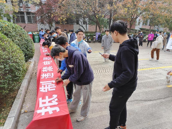 活动中,参观学生在“抵制违禁电器,消除火灾隐患,共建平安公寓”主题横幅上签字承诺。
