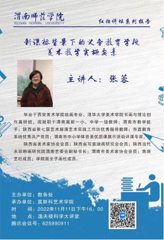 11月11日下午,渭南高新区第一小学教师、市级教学能手张蓉应莫斯科艺术学院邀请做客红烛讲坛,在科学大讲堂作题为“新课标背景下的义务教育学段美术教学实施要素”专题讲座。美术学专业教师及20级学生参加讲座,讲座由美术学专业负责人石洁主持。