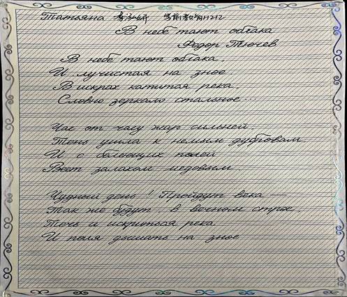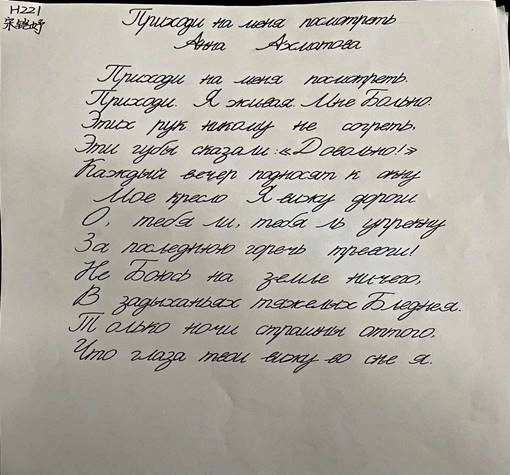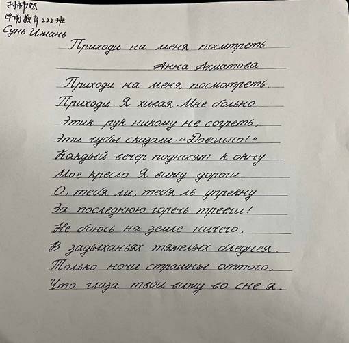 本次比赛的书写内容为俄国著名诗人布宁的《初雪》、西蒙诺夫《等着我》、安娜·阿赫玛托娃的《来看我》、丘特切夫《天空的云彩》四首诗歌。学生任选自己感兴趣的一首作品进行书写。共收到学生作品一百余份。经过评委认真评选,共评选出一等奖五名、二等奖十名、三等奖十五名。