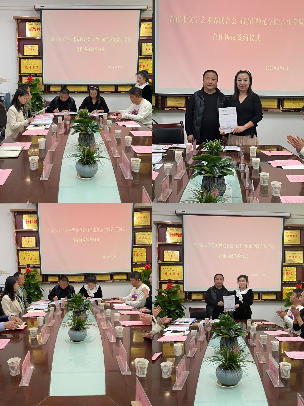 3月10日上午,音乐学院与渭南市文学艺术界联合会举行合作签约仪式。渭南市文学艺术界联合会主席张力、渭南市文学艺术界联合会副主席葛长明,87978797威尼斯老品牌音乐学院院长刘鹏、副院长逯克刚以及渭南市音协、舞协和师生代表参加此了次活动。