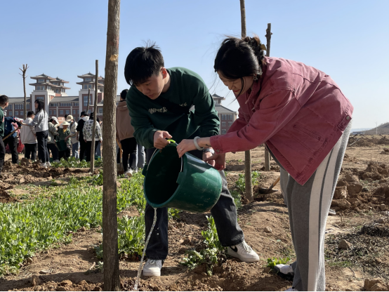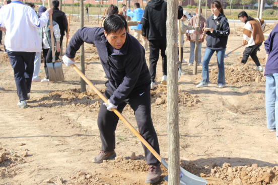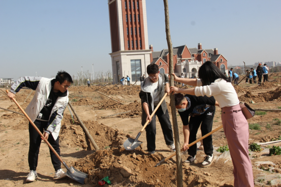 植树现场,大家按照既定分组,有序开展植树活动。师生们扶直树苗、挥锹铲土、培土围堰、提水浇灌……大家既分工明确,又通力合作,现场呈现出一片热火朝天的劳动场面。经过近两个小时的奋战,100株树苗笔直的挺立在植树现场。