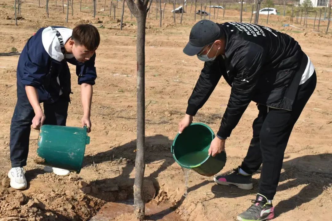 植树现场,学院领导带领参与植树的师生进行分工协作,大家热情洋溢、干劲十足。两三人一组互相配合,挖坑、植树、浇水、覆土、固定、手起锄落、放苗回填、提水浇灌……整个过程一丝不苟;各个环节衔接有序、配合默契,齐心合力栽下一棵棵树苗。经过一番辛勤的劳动,棵棵新树昂首挺立,为校园再添新绿。