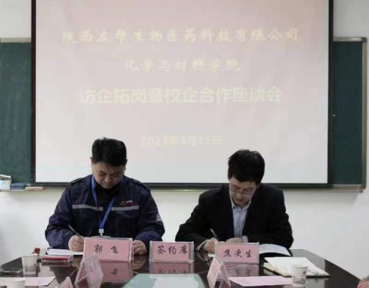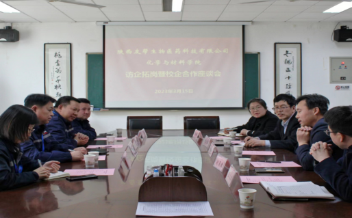 3月15日下午,化学与材料学院与陕西友帮生物医药科技有限公司于学院会议室举行校企合作座谈会。陕西友帮生物医药科技有限公司行政副总郭飞、生产副总纪成勇、技术总监王振、人事部长蒙明珠,学院党政领导班子共同出席了本次会议,会议由党总支副书记任晓婷主持。