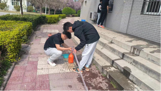 清扫过程中,同学们分头行动,有条不紊、分工明确,干劲十足。大家冲洗了门窗上的灰,通知、公告栏进行清洗,对平时不注意的花坛、清洁死角等地方都进行彻底打扫,众人一心使运动场周围环境焕然一新。