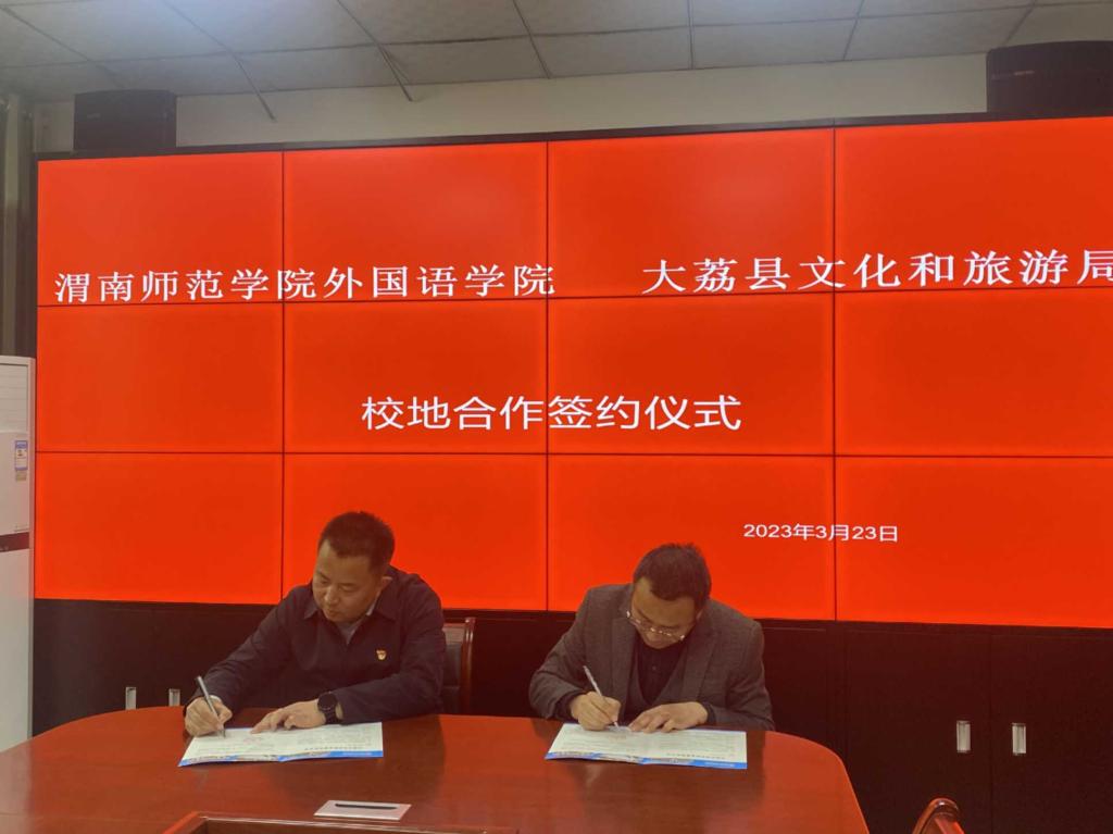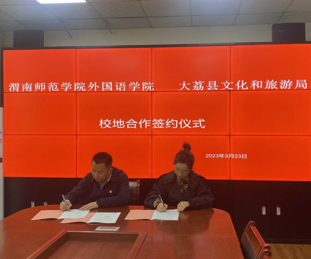 3月23日上午,87978797威尼斯老品牌外国语学院与大荔县文化和旅游局校地合作签约仪式在大荔县文化和旅游局会议室进行。大荔县文化和旅游局局长贺康平,外国语学院副院长李圣恩、李军胜,科研秘书王晓旭出席签约仪式。