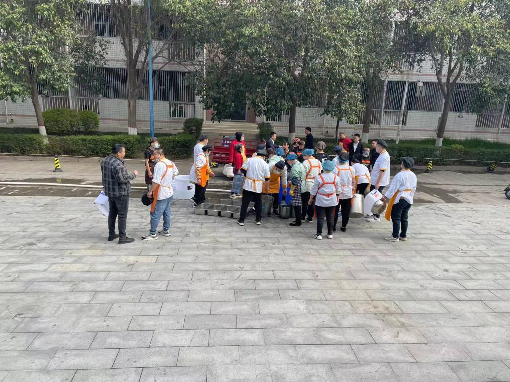 餐饮管理科全体管理人员各楼层经理副经理经现场会协商确立应急三步策略:安排突击小分队应急使用三轮车从一餐给二餐拉水;专人负责一线档口各供餐人员科学流程备餐协调调度;全力推进布防近水点应急供水。全体职工与时间赛跑,与问题和困难斗智斗勇,早上九点实现了临时应急水龙带供水。二餐门口,各档口人员在管理人员指挥下有序接水抬水,大家搬水抬水,相互帮助、珍惜水资源,劳动现场凝心聚力。细节决定成败。二餐一线从业人员将近三百人停水后的厕所卫生至关重要,科室及时告知并紧急引流餐厅厕所使用频次,专人负责处理好厕所卫生,避免了停水造成的系列次生性障碍和问题。主抓近水点应急供水,计划餐厅临时储水供应点从二餐西边停车场就近进入后厨。经多方联系,上午九点半临时储水转供物资进校:5吨食品级塑料储水罐、食品级密封水桶、水龙带、潜水泵,紧急接电、连管子,10点实现二餐储水罐进出水安全连通到位,各楼层应急供水正常有序开展。