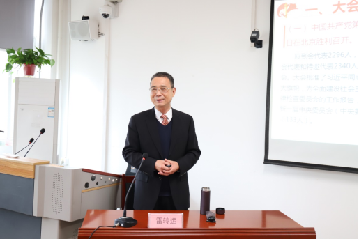 雷转运教授以夺取新时代中国特色社会主义新胜利的政治宣言和行动纲领为主题,从大会概况与历史背景、大会主题与重大意义、报告主要内容级及价值意义、新思想新观点新要求、非凡十年、马克思主义中国化时代化、中国式现代化、坚持自我革命、全面学习等九方面作了精彩报告。