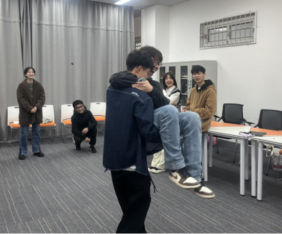 第三个游戏叫“抢凳子”,由选10人围着7个椅子站一圈,一人敲鼓。鼓响人转,鼓停抢座位。每次淘汰一人,之后再减少一个椅子。如此循环,直到最后一人胜出。同学们都聚精会神的进行游戏,生怕一个不小心自己就“掉凳”了,房间里充满了同学们的欢乐声。