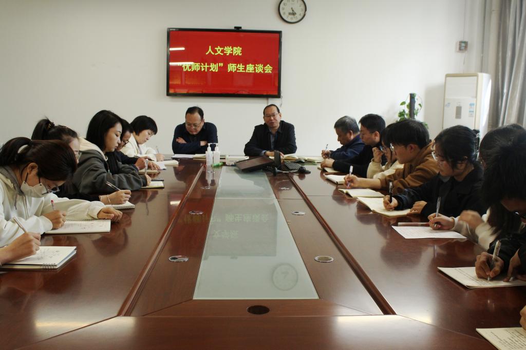 4月7日下午,人文学院召开“优师计划”学生座谈会。该院党总支书记李三岗,院长赵前明,党总支副书记、副院长张晶,副院长雷炳锋,历史系主任王文涛,辅导员邱渭勤、孙丽诗以及2021级、2022级历史学“优师计划”的20名学生代表参加了座谈。