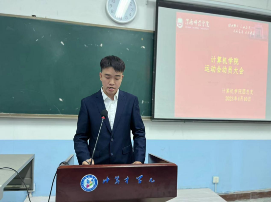 接着,学生会各部门部长逐一进行工作汇报,学生分会执行主席杨泽明宣读学校《关于举办2023年体育文化节暨春季田径运动会的通知》,运动员代表马维申同学进行表态发言。