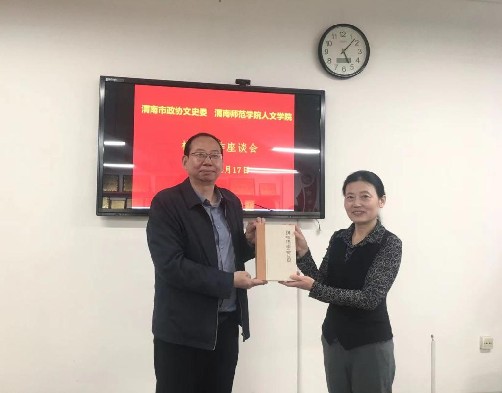 王俊侠介绍了近期文史委工作的主要内容,并表示希望借助校地合作契机,对渭南历史记忆、景观遗存、人文故事、文化传承等方面的文史资料进行学术性梳理。渭南市临渭区政协原副主席权佩亮讲述了他在人文学院挂职期间的所见所感,对学院教师敬业乐业的工作精神和深厚扎实的学术功底表示赞许,并对政协文史资料工作所遵循的“亲历、亲见、亲闻”的“三亲”原则进行了阐释。